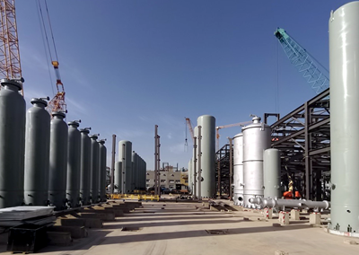TSA/PSA成套包設(shè)備共35臺(tái),主要設(shè)備有吸附塔、緩沖罐,此單元用于提純合成氣中的CO和H2,用壓縮機(jī)增壓后送入甲醇和乙醇裝置作為原料氣使用。