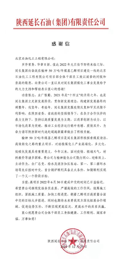 在北京石油化工工程有限公司總承包的延長(zhǎng)石油榆神能化50萬(wàn)噸/年煤基乙醇項(xiàng)目緊鑼密鼓、加快建設(shè)的關(guān)鍵時(shí)期,12月29日,陜西延長(zhǎng)石油(集團(tuán))有限責(zé)任公司向我公司發(fā)來(lái)感謝信,對(duì)我公司2021年乙醇項(xiàng)目建設(shè)工作給予了充分肯定和高度評(píng)價(jià)。