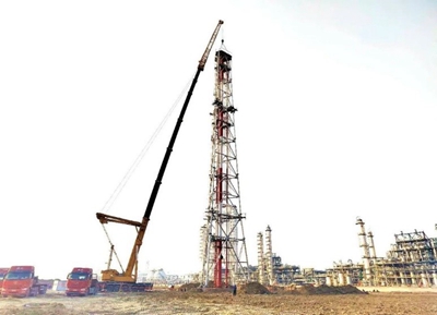 據悉,該火炬高80米,總重100噸,分三段在地面組裝后依次進行吊裝。為確保吊裝工作的順利進行,項目部組織業主、監理、承包商對火炬組裝的質量及組裝臨時平臺的搭設情況進行全方位檢查,吊裝過程中,項目人員嚴格按照操作規程執行,確保吊裝作業的安全、平穩。目前,施工人員正加緊配套地面火炬管廊、附屬設備等相關工作,加班加點確保火炬按期投用。